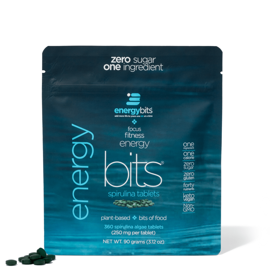 Looking for a fast, easy way to fuel your day and have your nutrition and protein needs met without cooking or cleaning? ENERGYbits® spirulina tablets supercharge your work day and workouts by giving you steady energy, focus and endurance. These nutrient dense, antioxidant-rich, high-protein, plant-based tablets reduce hunger and improve focus without chemicals, caffeine or sugar. With more protein than steak (3x steak), and just one ingredient and one calorie per tablet, ENERGYbits® are perfect for intermittent fasting, snacks and sports. Grown organically and endorsed by doctors nationwide.