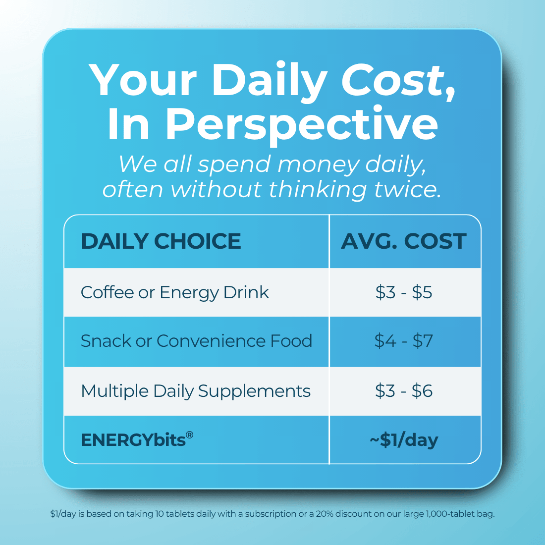- All-in-one (VITALITYbits® blend): 15–30 tablets anytime.